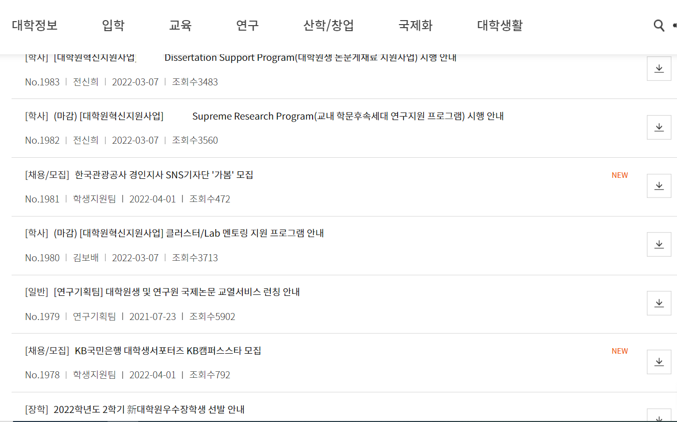가장 추천하는 곳입니다. 다른 대외활동 정보 사이트와는 다르게 알짜배기 정보로만 이루어져 있습니다. 주기적으로 학교 공지사항을 확인하여 학교에서 지원하는 여러 활동들을 경험해보는 것을 추천합니다.